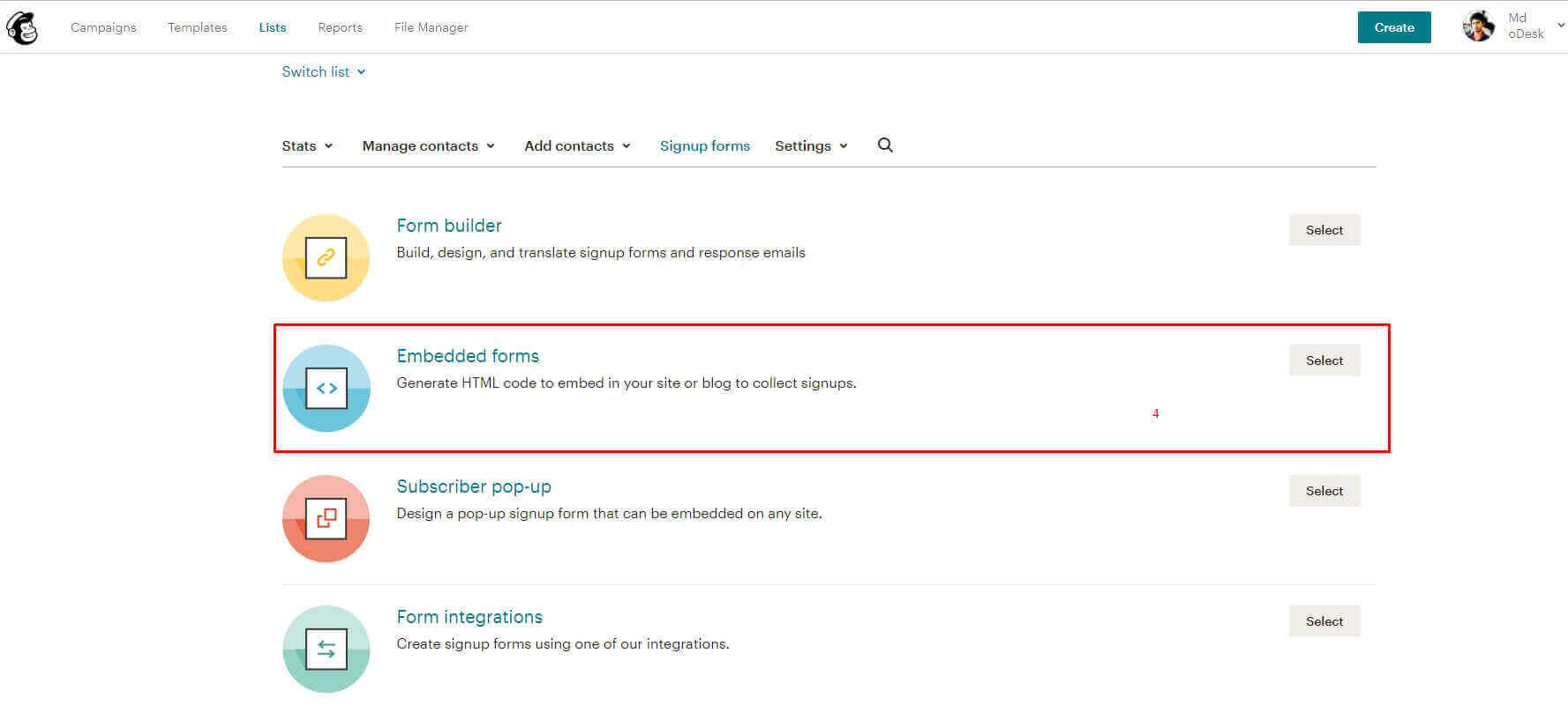 1. Log into your MailChimp account and click on the List from the top menu. Create a mailing